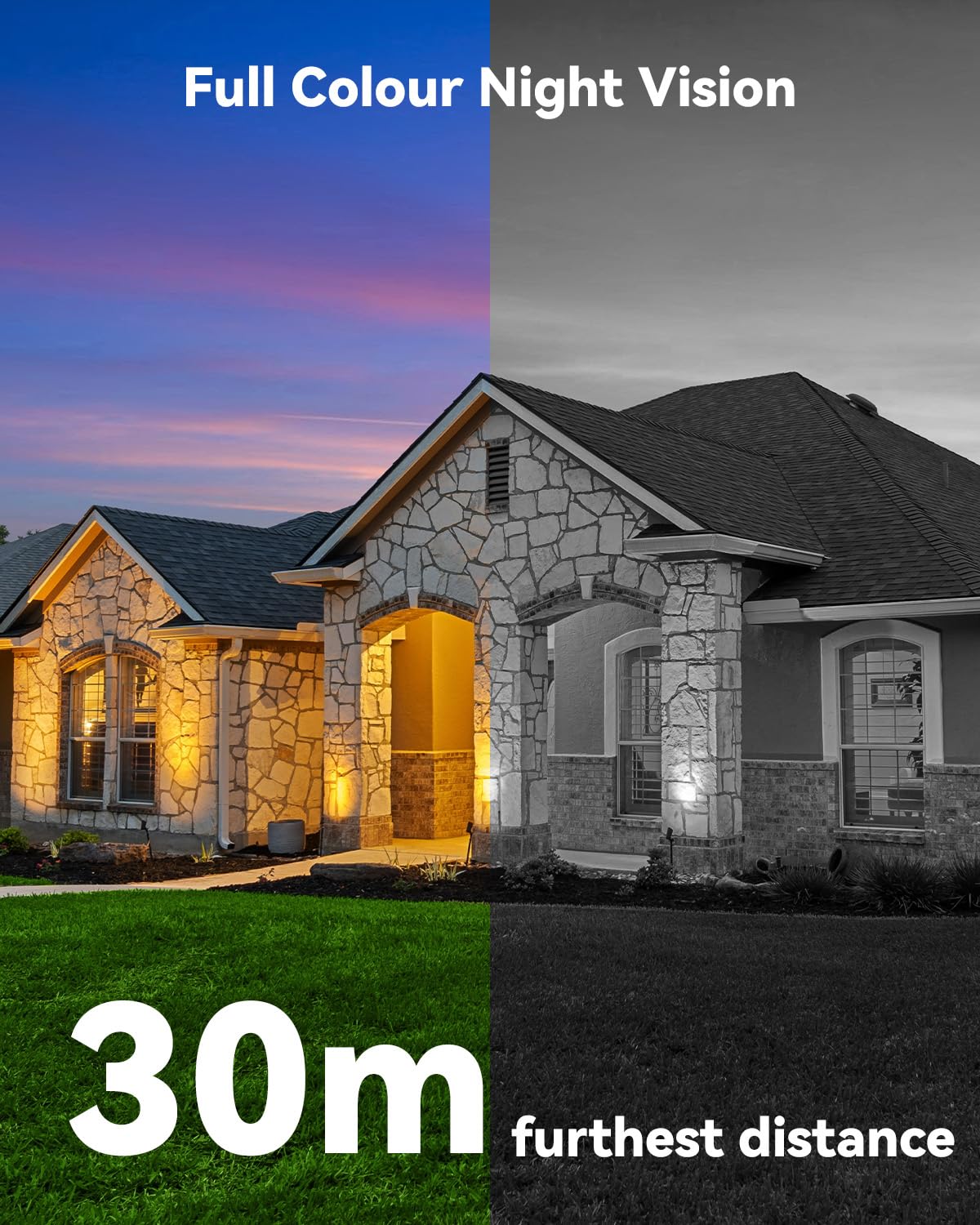 - 【8 Million Pixels & 30M Colour Night Vision】With a total of 8 million pixel dual-camera resolution: 3 million pixels fixed lens + 5 million pixels rotating lens, presenting you with more realistic and detailed monitoring screen details. The outdoor camera wireless has 4 night vision modes, the lens has 8x zoom function, with a maximum distance of 30m(98ft), providing clear full colour or black and white images even in complete darkness.
