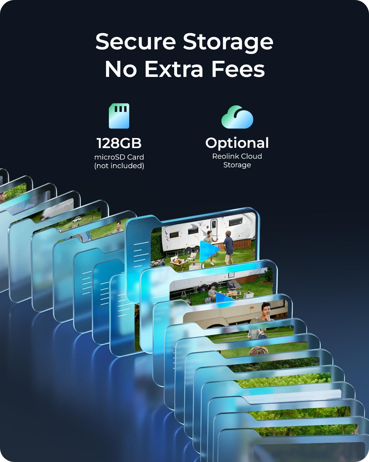 - Local / Could Storage: Motion videos can save locally to microSD card (up to 128GB, not included) and a 32GB microSD card is pre-installed in the no wifi security camera. The encrypted Cloud service ensures that recordings are stored securely.